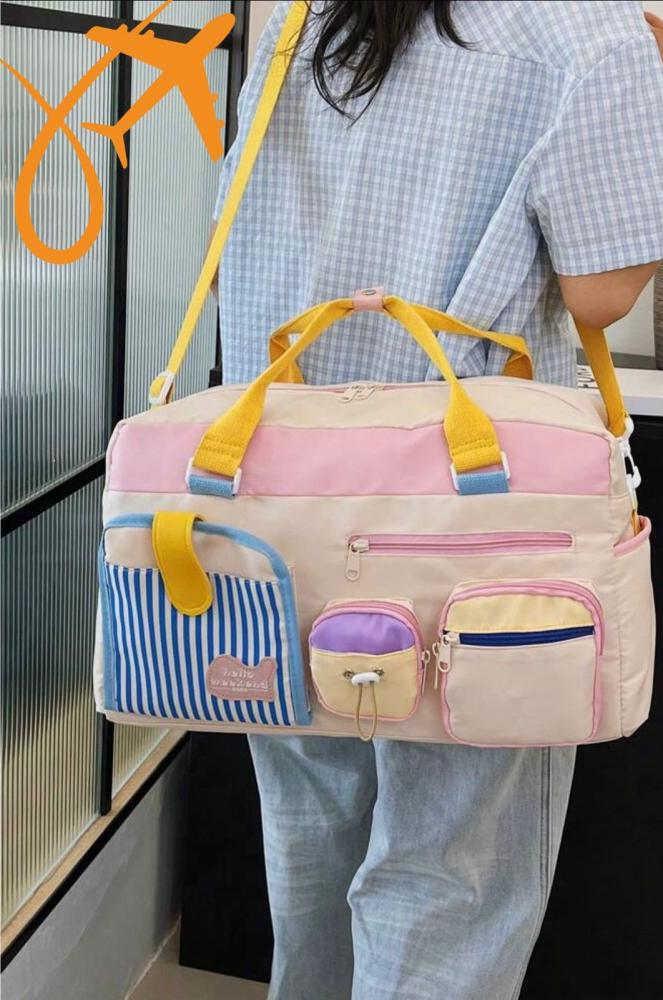 حقيبة سفر نايلون بتصميم ألوان متباينة وسعة كبيرة فيها جيوب وسحاب متعدد عشان كل شي يكون مرتب وسهل الوصول.